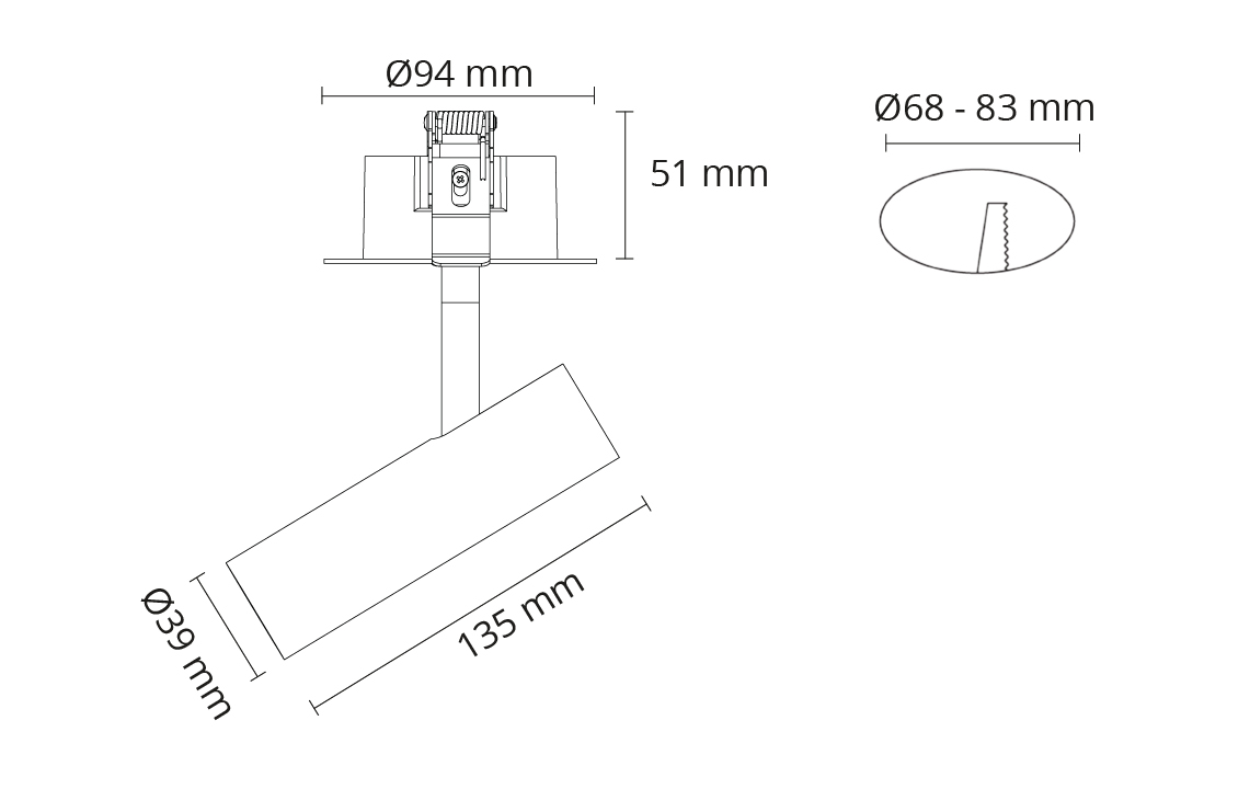 Tube Micro R er en slank og nett spotlight for innfelt montering i rette tak eller skråtak. Den har et minimalistisk og eksklusivt utseende. Den har et godt lys som kan brukes indirekte til allmennbelysning eller direkte til å fremheve deler av omgivelsene. Spoten kan roteres og vippes nøyaktig dit lyset trengs. Den er enkel å installere i hull i taket ved hjelp av fjærer. Er ideell for rehabilitering, da den passer i hull fra Ø68-83. Passer også rehabringer (tilbehør) opp til Ø250. Driver og koblingboks plasseres i taket, og er IsoSafe, dvs at de kan dekkes med isolasjon. Kan kobles i sløyfe, og er klasse II for enkel utskifting der det ikke finnes jordledning.Tube Micro R leveres med en svart baffel som standard, med lav blending. Bafler i hvitt og gull er tilgjengelig som tilbehør