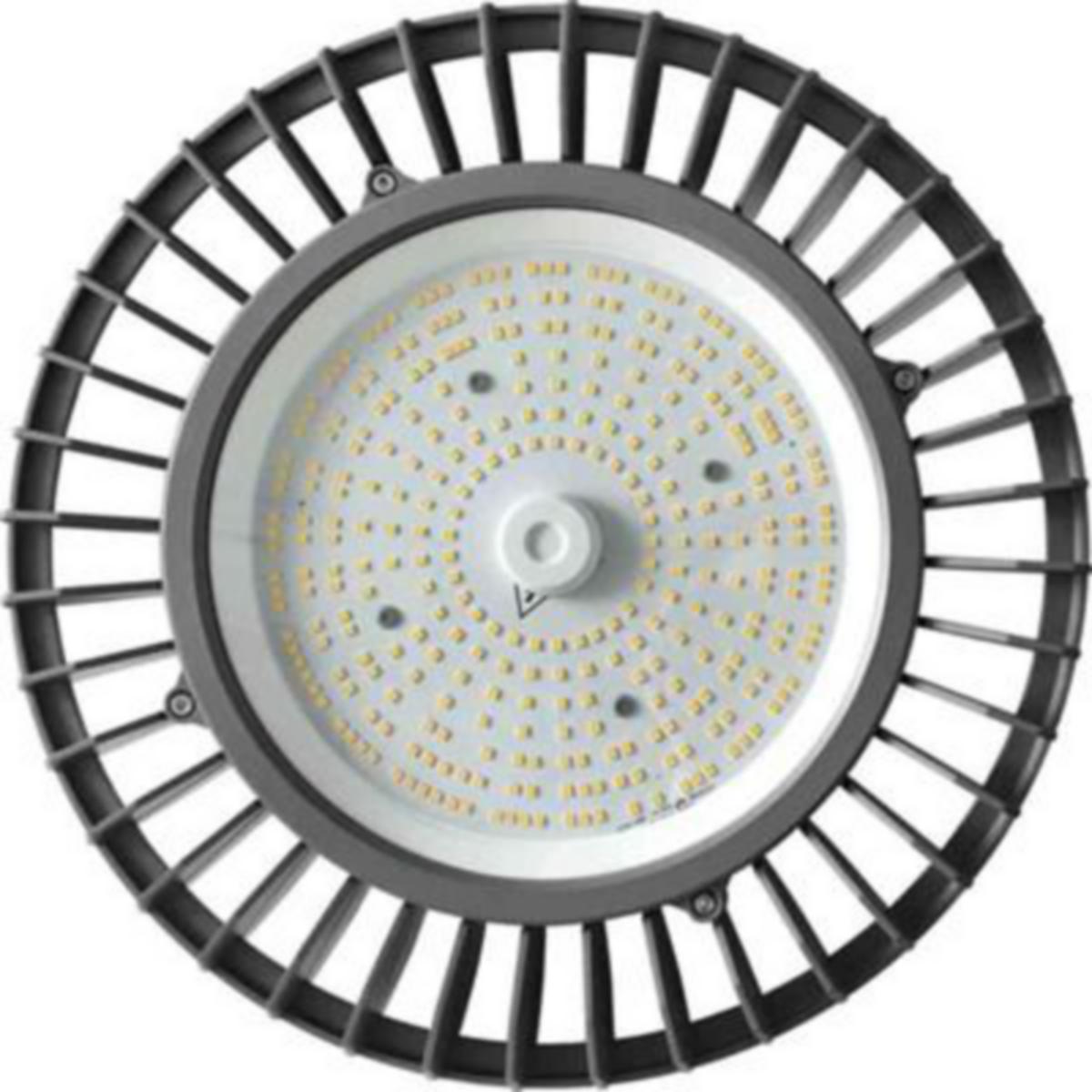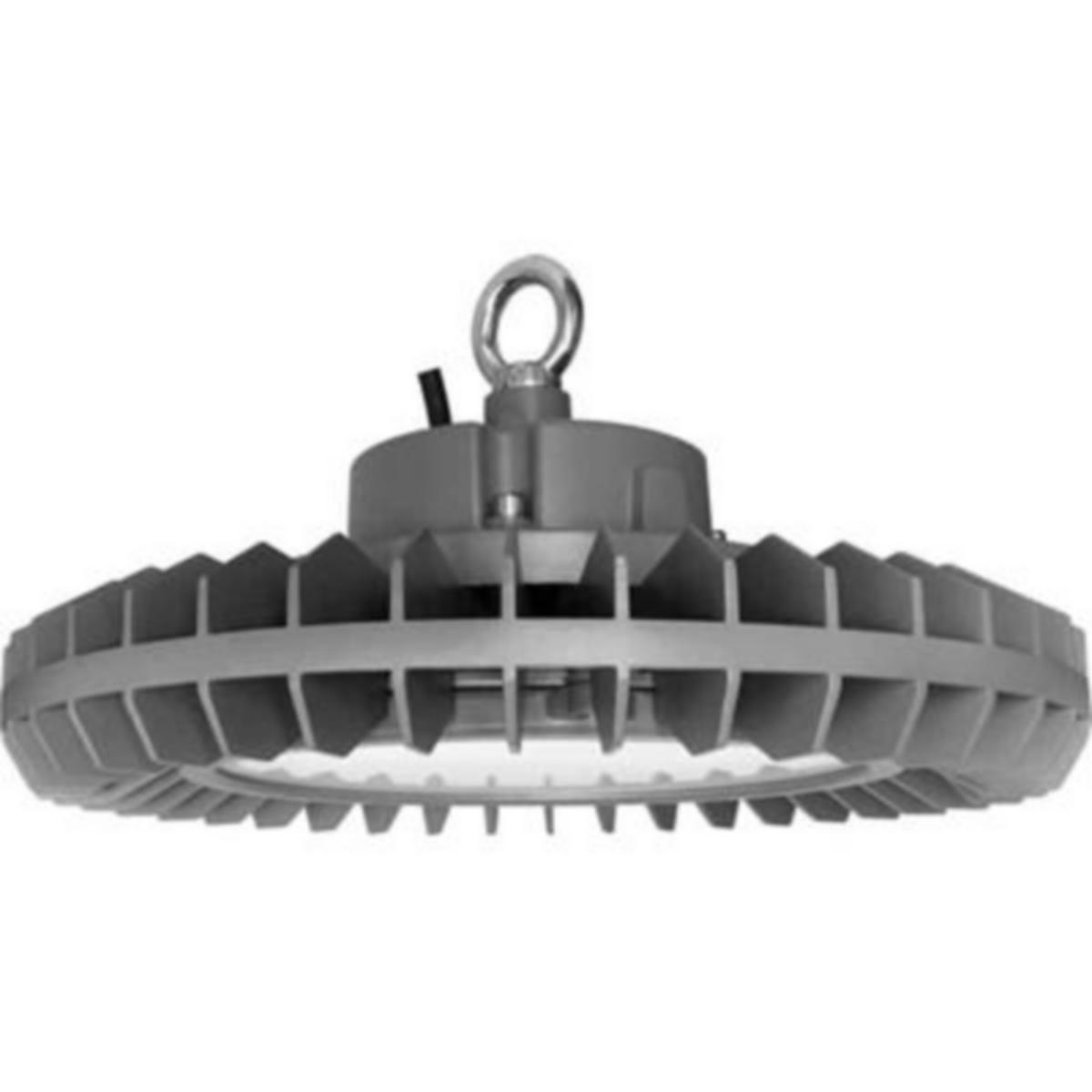 Høyhøyde armatur for åpne rom. Lakkert i Akzo Nobel pulverlakk i en lys grå nyanse som passer for både industrimiljøer og kjøpesentre. Montert pendel i kjede eller wire. Spredningsvinkel 110°.