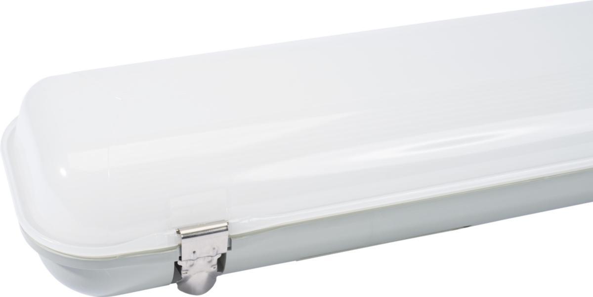 Tyfon II er den ultimate LED universalarmaturen. Den passer like godt i industri, lager, landbruk, parkering som utendørs. LED-chipper og forkobling er montert på en egen komponentplate som enkelt kan byttes ut helt uten bruk av verktøy ved service. Komponentplaten er tilkoblet den 5-polede gjennomgangskoblingen i armaturets bunn med en IP20 hurtigklemme som enkelt splittes. Ved service vil det med denne løsningen være mulig å gjøre service uten å slukke all belysningen. Tyfon II fungerer ypperlig i kulde, og er mye mer energieffektiv enn vanlige lysrør. Lysytelsen er tilpasset 1 til 1 utskifting av 1x58W, 2x36W eller 2x58W lysrør. Skjerm og stamme er i slagfast polykarbonat (IK08). Skjerm- og opphengs-klips er i rustfritt stål. Pakknippler, wirefeste og tak/veggklips leveres med armaturen. Gjennomgangskobling 5x2,5mm2. EM03 er nødlysarmatur med 3t-batteri og selvtest. Sensorversjonene har er en integrert mikrobølgesensor. Klasse I, IP65