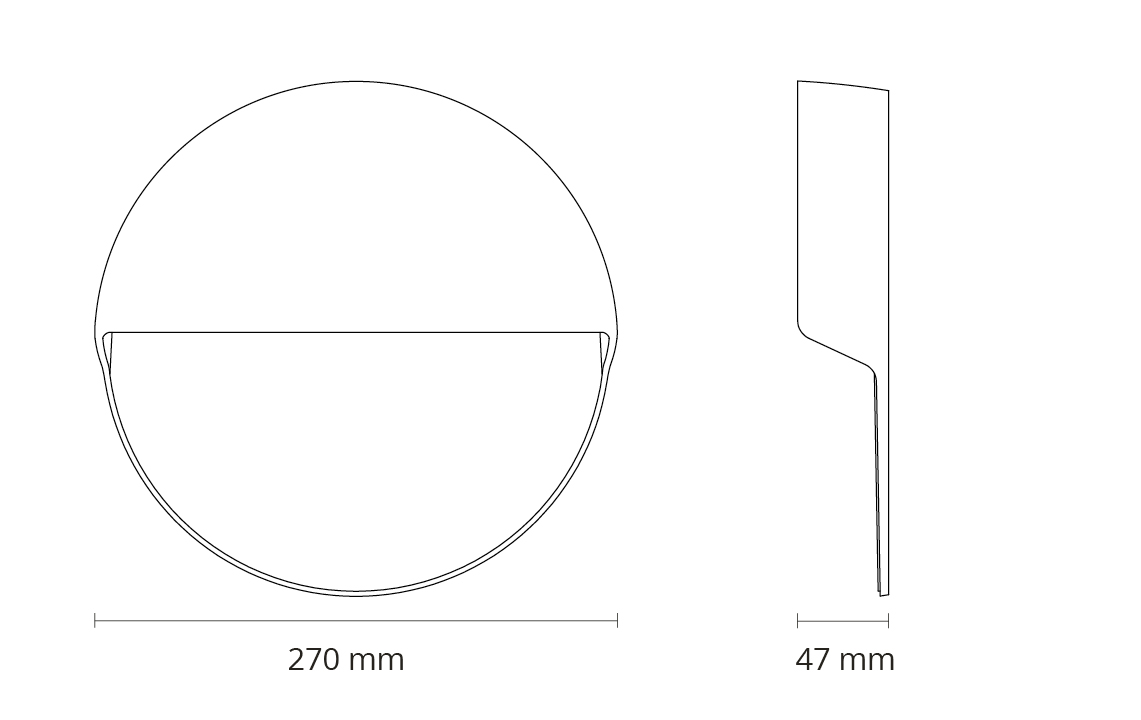 Slank, stilren veggarmatur med inntrukket, litt skråstilt lyskilde. Godt egnet for ved for eksempel gangstier eller i korridorer. Svært effektiv med høy lumen per Watt. Kan dimmes med faseavsnitt-dimmer. Enkel installasjon med monteringsbakplate, to kabelinnganger og hurtigkobling. Høy kvalitet i trykkstøpt, pulverlakkert aluminium. Kan også brukes på stolpe.
