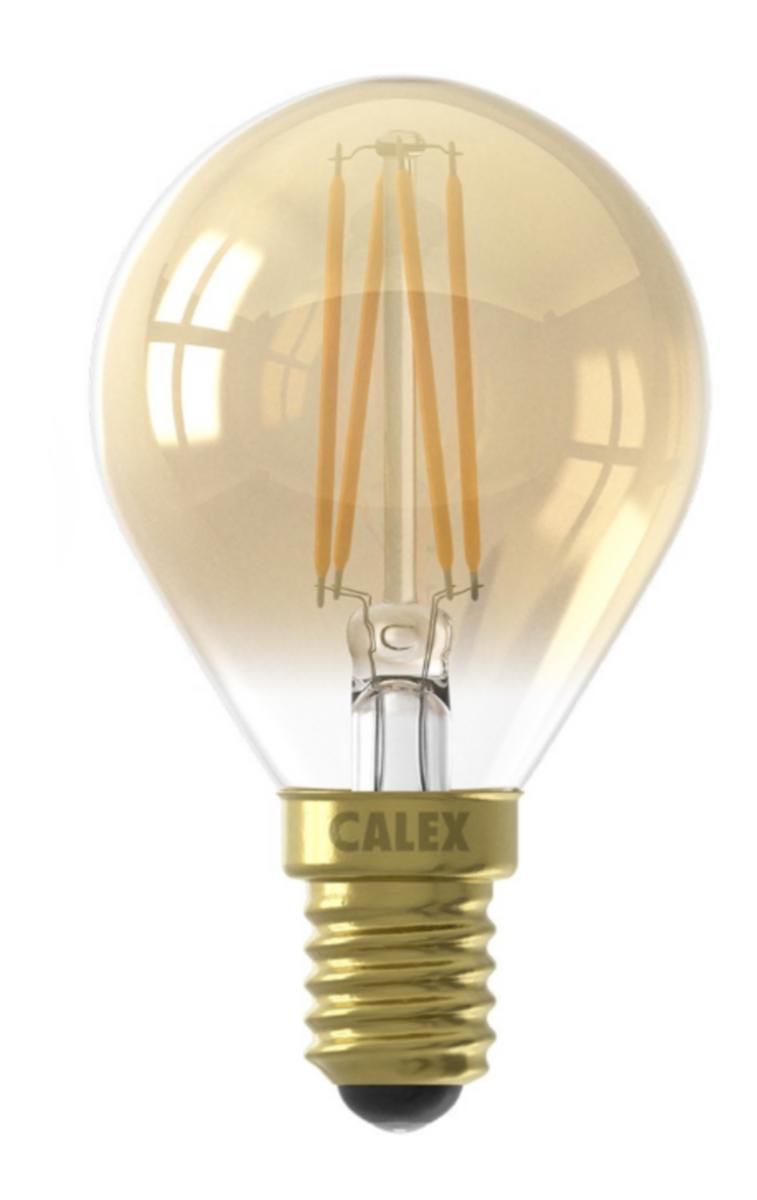 LED illum med gullfarget, klart glass samt rette og kryssede filamentråder. Ekstra varmhvit fargetemperatur 2100K. Dimbar. Levetid 15000 timer / L70. 250 lumen, 3,5W. Rundtstrålende 360°