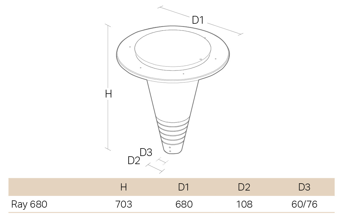 Lyskilder Ray D/I LED (3000K): 28W, 40W Ra> 80, SDCM: 3 L70/>50.000 timer ved Ta=25°C Elektrisk beskyttelse Klasse I eller klasse II, IP65. Ta=25°C, IK10, CE. Montering/Tilkobling Armaturer for mastetopper kan monteres på master med toppdiameter, Ø60mm, 76mm eller 108mm. Master bestilles separat. Armatur er montert inkl 5.0m kabel. Forkoblingsutstyret og lyskildesokkel er montert på utstyrsskinne med plugg/sokkelarrangement for enkel montering på armaturhus. Vindprojekterede areal 1830 cm2 - max 8 kg.