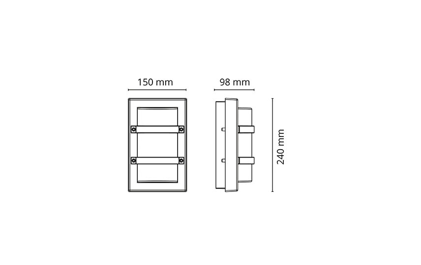 Rektangulær veggarmatur med dekorative beskyttelsesbøyler for utendørsbruk. Armaturen er utført i trykkstøpt aluminium, pulverlakkert sort eller grafitt, med skjerm i UV-stabilisert opal polykarbonat. Enkel montering med hurtigklemmer, to inn-/utganger for kabler, med mulighet for både skjult og synlig kabling. 10 års korrosjonsgaranti, beskyttelsesklasse IP65, slagfasthet IK10.