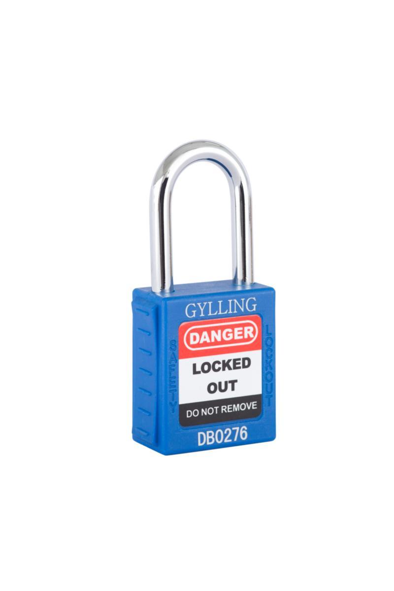 Blå 38 mm sikkerhetslås i nylon. Ulike nøkler og forkrommet stålsjakkel med diameter 6 mm. Når låsen er åpen, kan ikke nøkkelen fjernes.