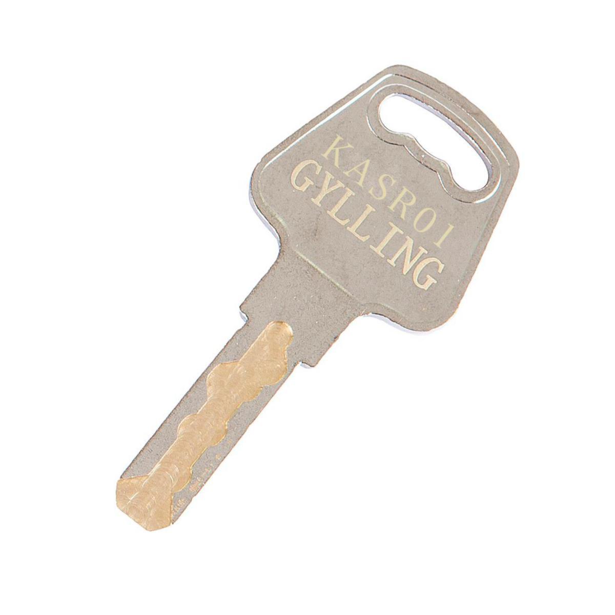 Rød 38 mm sikkerhetslås i nylon. Like nøkler KASR01 og forkrommet stålsjakkel med diameter 6 mm. Når låsen er åpen, kan ikke nøkkelen fjernes.