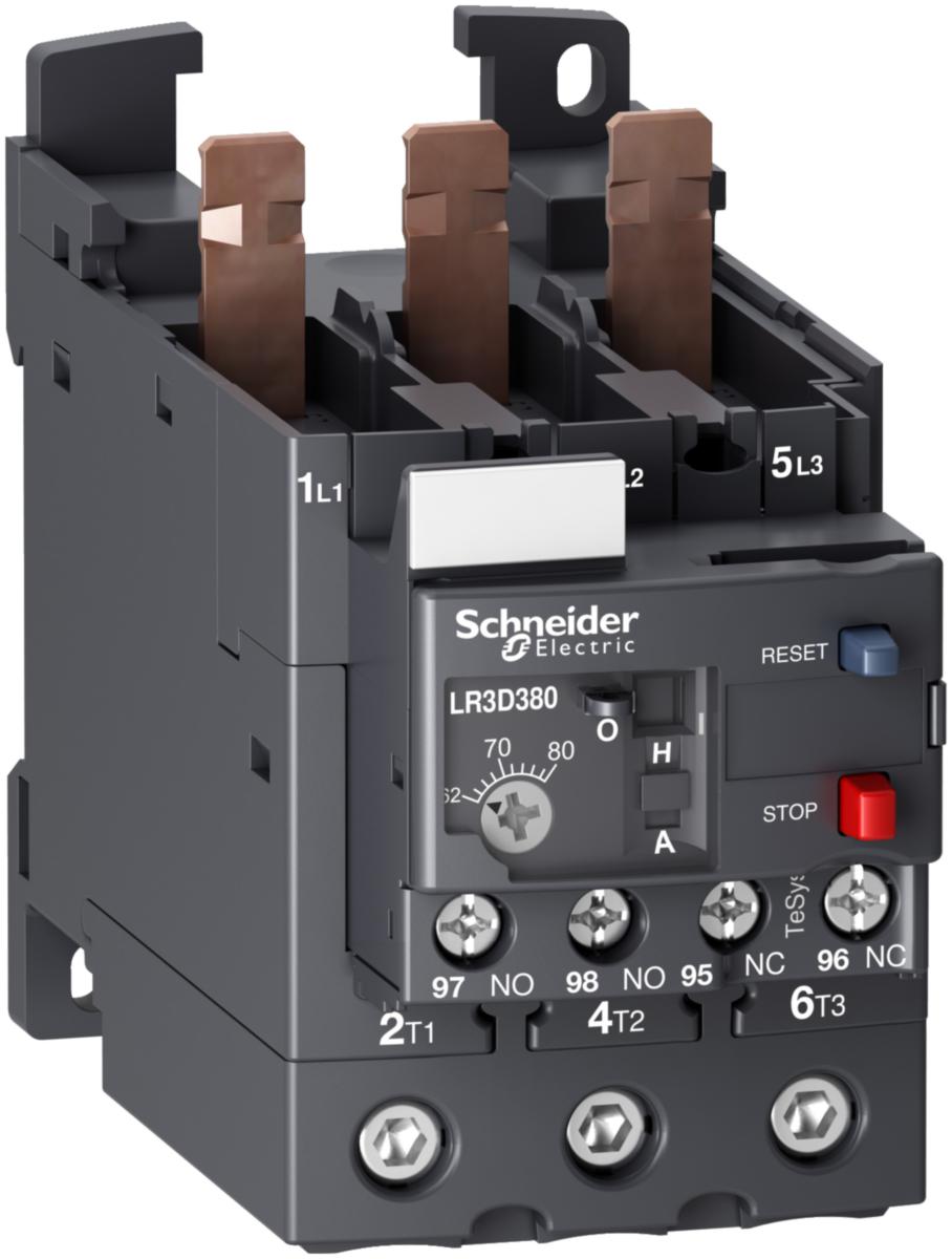Termiske vern, serie D. Opptil 150 A (0,06 - 75 kW) for både AC og DC-motorstyringer. Integrert manuell/automatisk reset. Normalstart (klasse 10): 2-10 sek og tungstart (klasse 20): 6-20 sek. Utløsetest og mekanisk utløseindikator. Utløsetid: 7,2 x Ir (innstil strøm). Kan om ønskelig "klikkes" enkelt til TeSys D kontaktor. Vernene LR9D er elektroniske og er beregnet for montering til LC1-D115 og LC1-D150 kontaktorer. Nye, smalere vern med Everlink terminaltilkobling er nå også tilgjengelig. Disse er angitt med Elink i varebeskrivelsen. EverLink er en patentert løsning som opprettholder konstant moment UTEN ettertrekking.