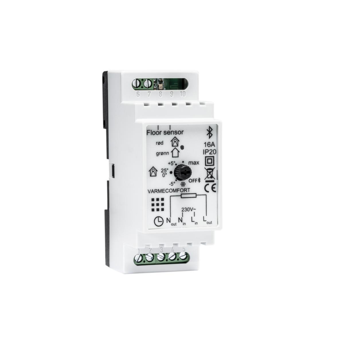 Comforttemp 140 m/bluetooth. Er en tavlemontert smart termostat for gulv- og romvarme og uteføler. Har innbygget romføler.