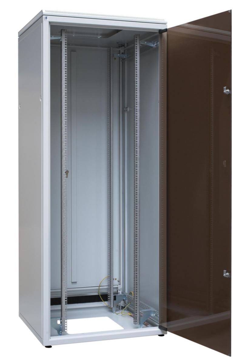 Skapet leveres ferdig montert i følgende standard konfigurasjon: 4 stk 19" justerbare profiler, 4 stk justerbare ben (kan justeres innenfra). Kabelinnføring m/børste i topp. Undertak klargjort for viftemodul. Dør i herdet farget glass, med stål "trimming" og 3 punkt lås. Avtagbare sidevegger og bakplate med lås. Jordforbindelse mellom alle dører/vegger til jordskinne. Åpent i bunn for vifte/filter eller kabelinngang. Andre farger og størrelser på forespørsel.