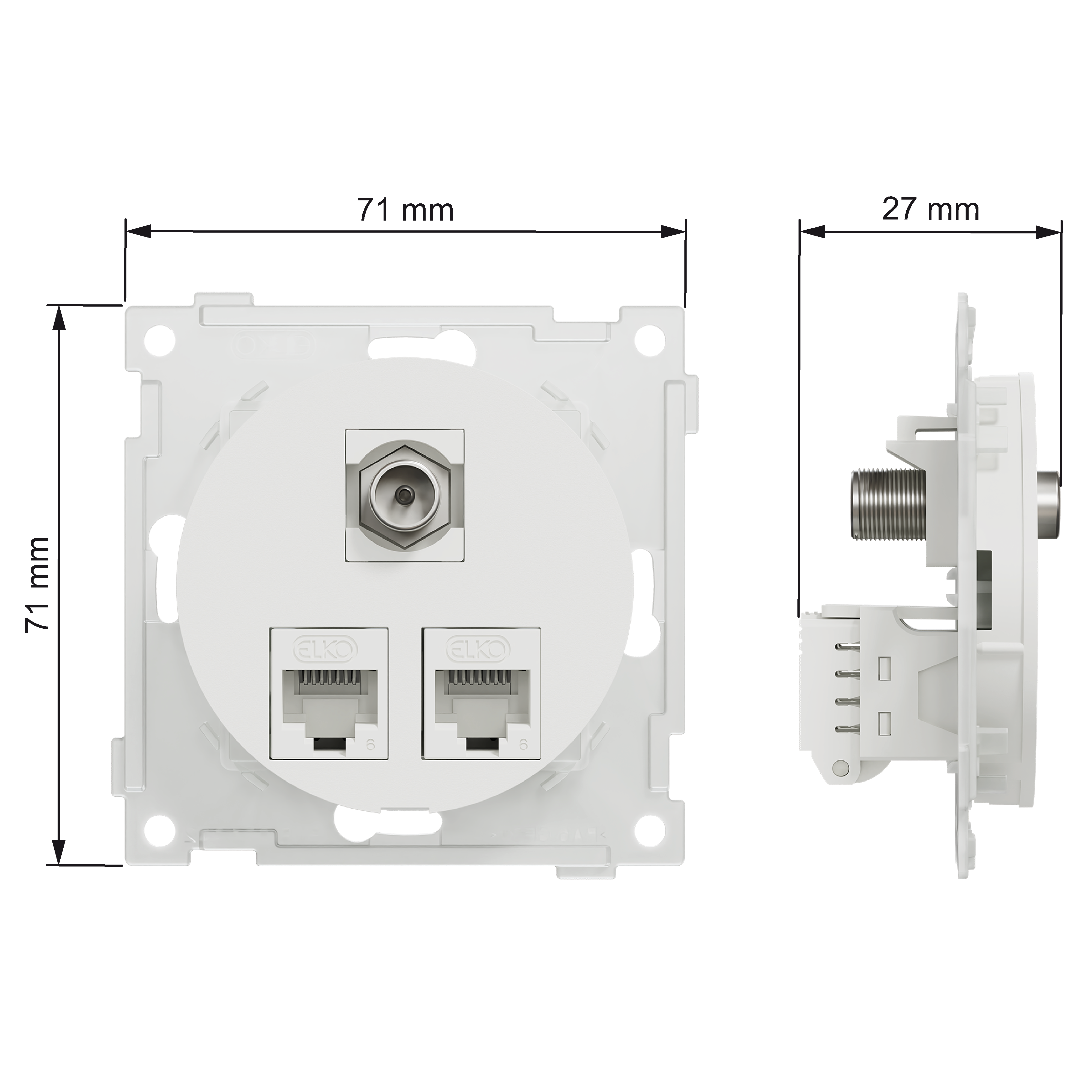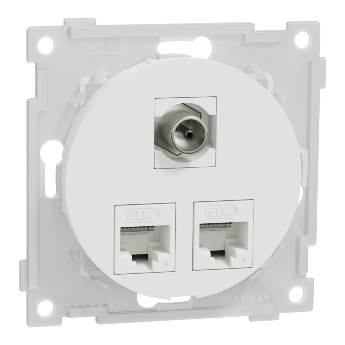 ELKO One - modularuttak 2x8 kat 6 UTP og 1x F/IEC, renhvit / Rett trippel modularuttak i ELKO One design. Uttaket leveres med 2 stk kat. 6 UTP ELKONNEKT kontakter og 1 stk IEC-Han for tilkobling av coax-TV. IEC kontakten har F-Hun tilkobling på baksiden. Kontaktene sneppes direkte inn i festerammen, og den medfølgende 3-hulls sentralplaten sneppes på plass.