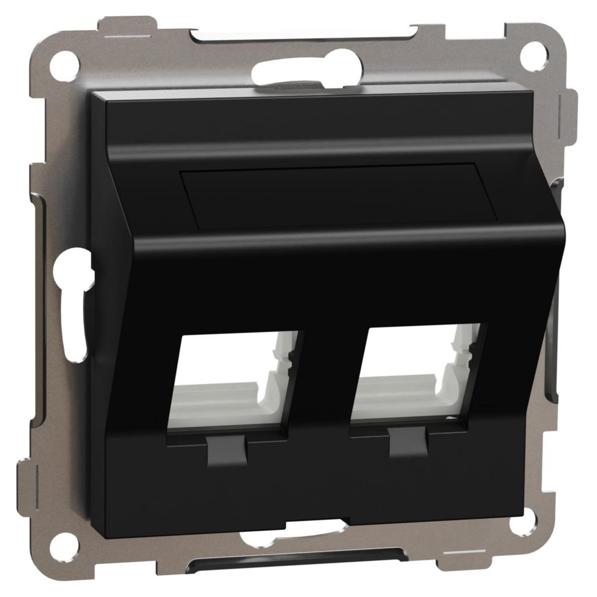 ELKO Sentralplate skrå, universal for 1x eller 2x Keystone eller S-One. Kontaktene sneppes direkte inn i festerammen, og den medfølgende 2-hulls sentralplaten sneppes på plass. Hullbilde og innfesting er tilpasset både Keystone og S-One konnektorer. Monteres i 1- til 5-hulls ramme, innfelt eller i høy påveggskappe eller hjørnekappe. Leveres med vendbart merkeskilt og 1 blindplugg. Mål på produktet er (B) 74,2 mm x (H) 74,2 mm x (D) 32,2 mm. Kompletteres med design ramme. Kapslingsklasse IP20. Farge: sort.