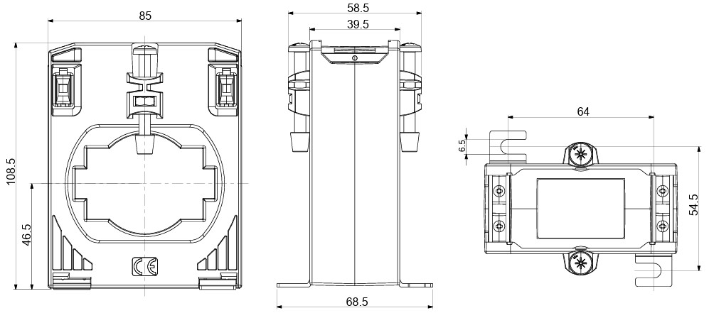 TDH8 serien leveres med lysåpning Ø44mm og utsparinger for montasje på strømskinne i størrelse 50x30, 60x12 eller 45x12mm. Det medfølger nødvendige innfestninger mot skinne samt festelabber for montasje direkte mot bunnplate. TDH8 kan og enkelt festes direkte mot kabel via buntebånd gjennom egne innfestninger på trafo. Med montasjeplate som leveres som tilbehør er det og mulighet for at montere trafo på standard 35mm din-skinne. Transparent termineringsdeksel for plombering medfølger.
