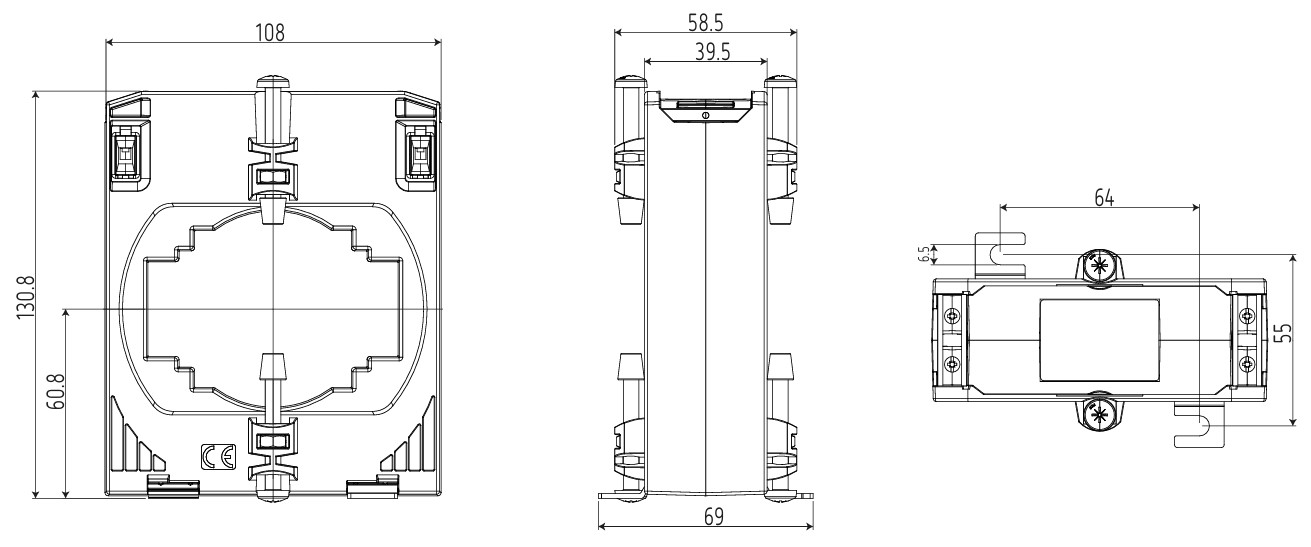 TDH10 serien leveres med lysåpning Ø63mm og utsparinger for montasje på strømskinne i størrelse 50x50, 60x30 og 80x30. Det medfølger nødvendige innfestninger mot skinne samt festelabber for montasje direkte mot bunnplate. TDH10 kan og enkelt festes direkte mot kabel via buntebånd gjennom egne innfestninger på trafo. Med montasjeplate som leveres som tilbehør er det og mulighet for at montere trafo på standard 35mm din-skinne. Transparent termineringsdeksel for plombering medfølger.