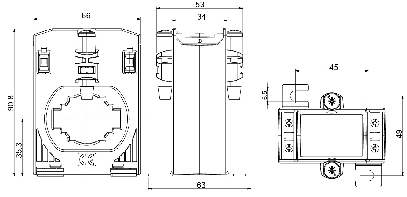 TDH6 serien leveres med lysåpning Ø28mm og utsparinger for montasje på strømskinne i størrelse 40x10, 30x15 eller 20x25mm. Det medfølger nødvendige innfestninger mot skinne samt festelabber for montasje direkte mot bunnplate. TDH6 kan og enkelt festes direkte mot kabel via buntebånd gjennom egne innfestninger på trafo. Med montasjeplate som leveres som tilbehør er det og mulighet for at montere trafo på standard 35mm din-skinne. Transparent termineringsdeksel for plombering medfølger.