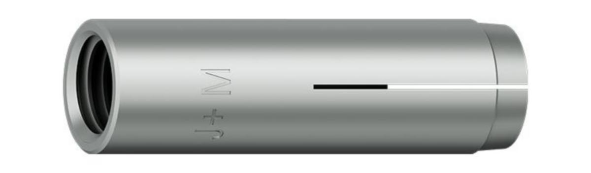 Slaganker for forinstallasjon med monteringsverktøy. Innvendig gjenge for metriske skruer og gjengestenger. Anbefalt skruelengde er 1–1,5 x ankerets diameter + montasjetykkelsen. Lav boredybde forenkler boring og takmontering. Egnet for sprinklersystemer.