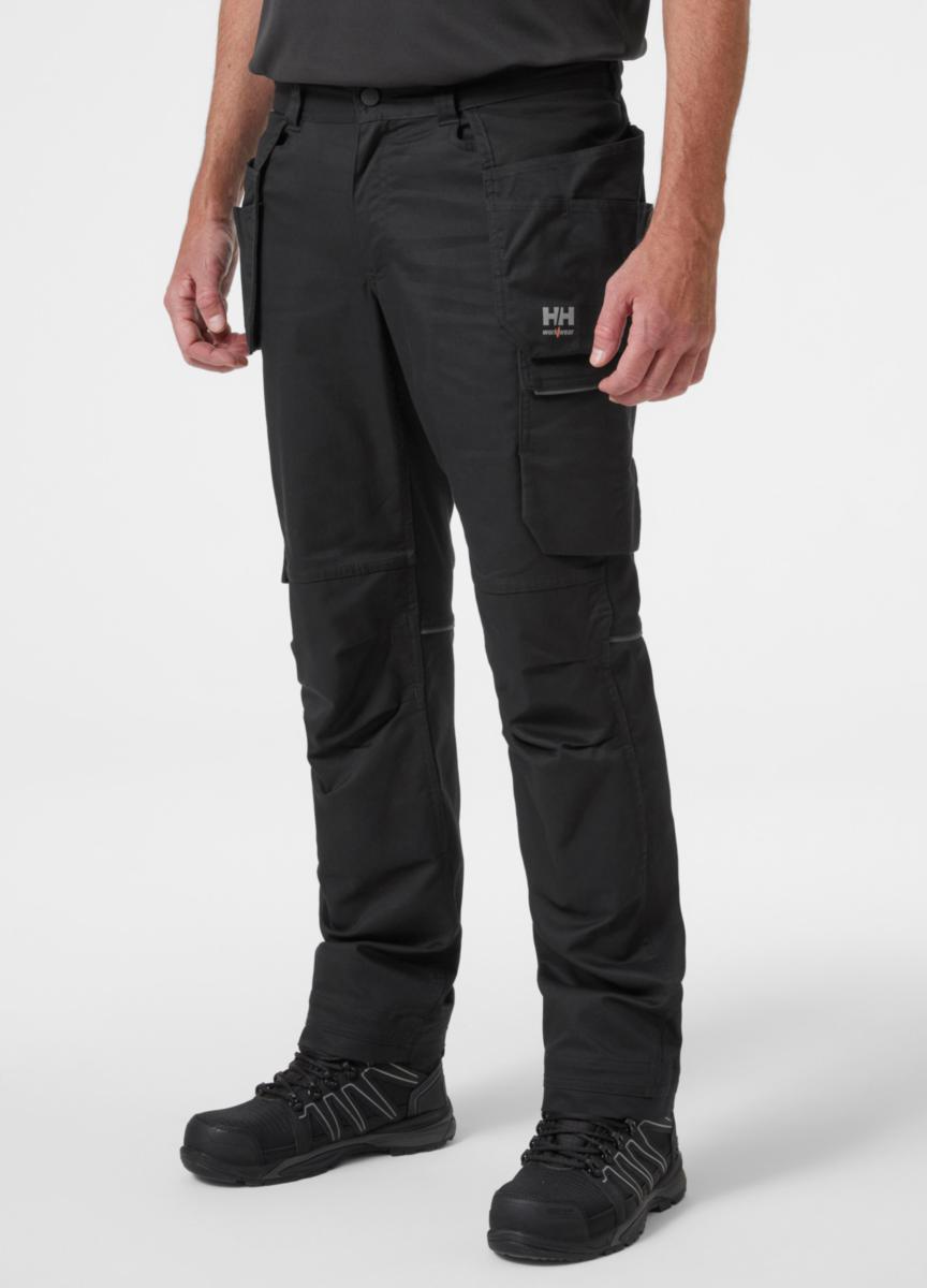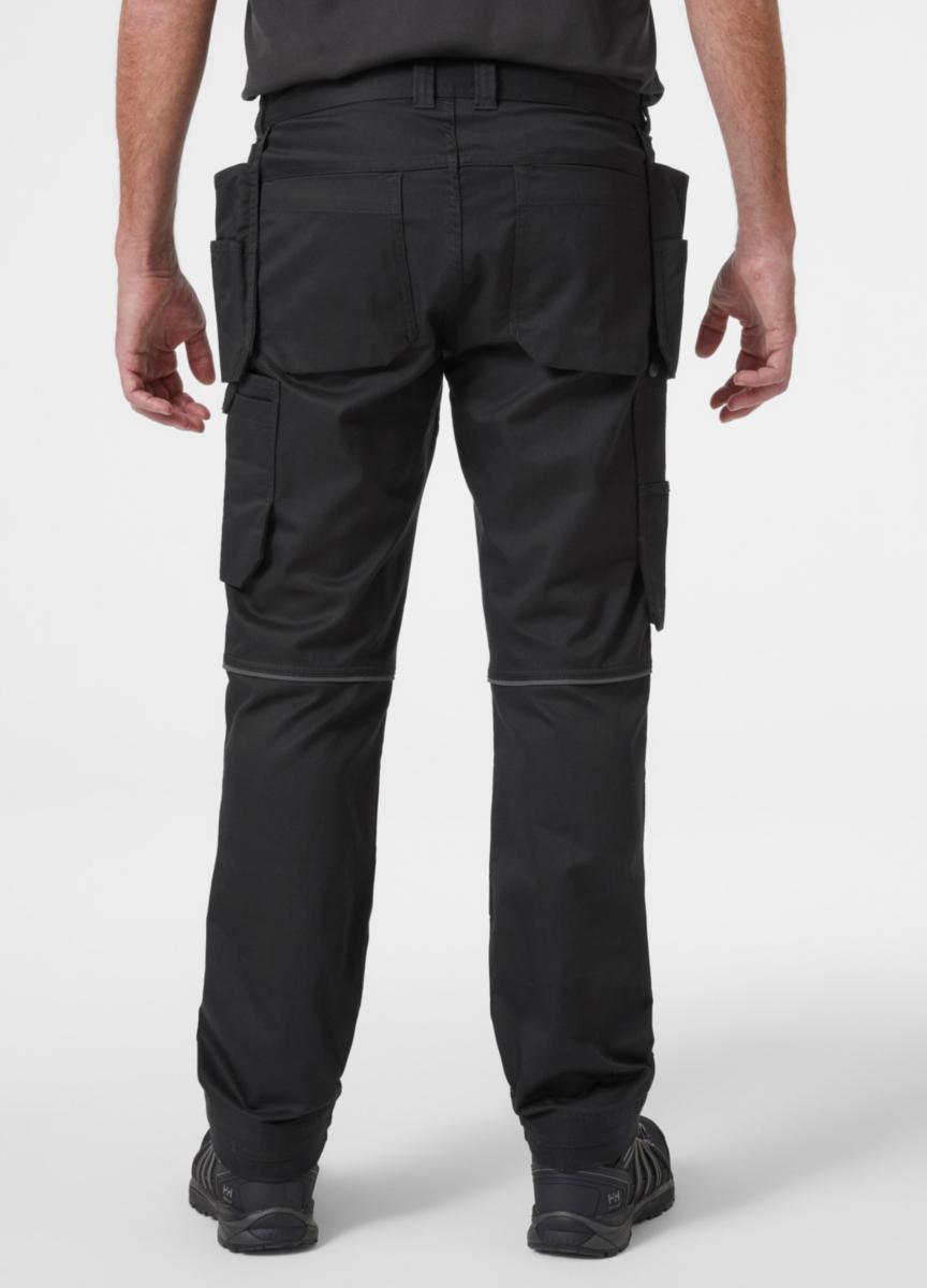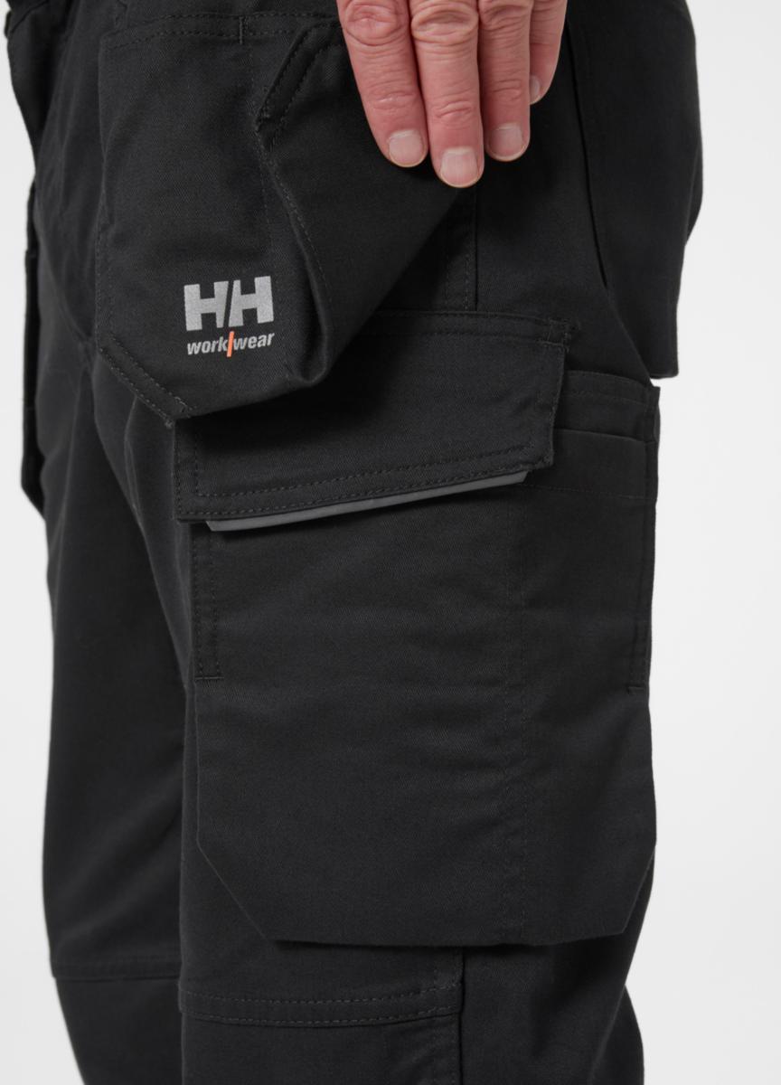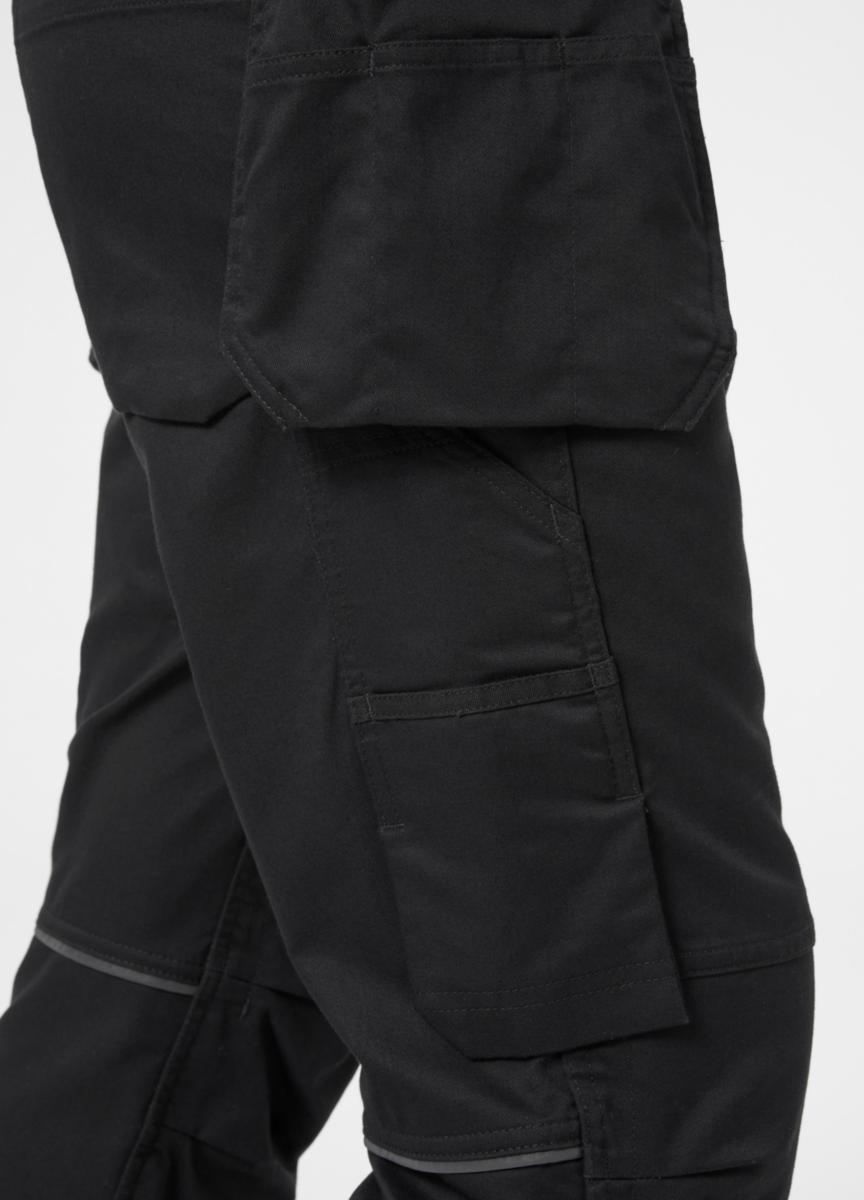 En håndverksbukse med 2-veis stretch. Reflekterende sømmer. Skrittkile. Lårlomme med trykknapp. Tommestokklomme. Lomme for ID-kort. Kneputelomme fra innsiden. Benlengden kan justeres med 5 cm.