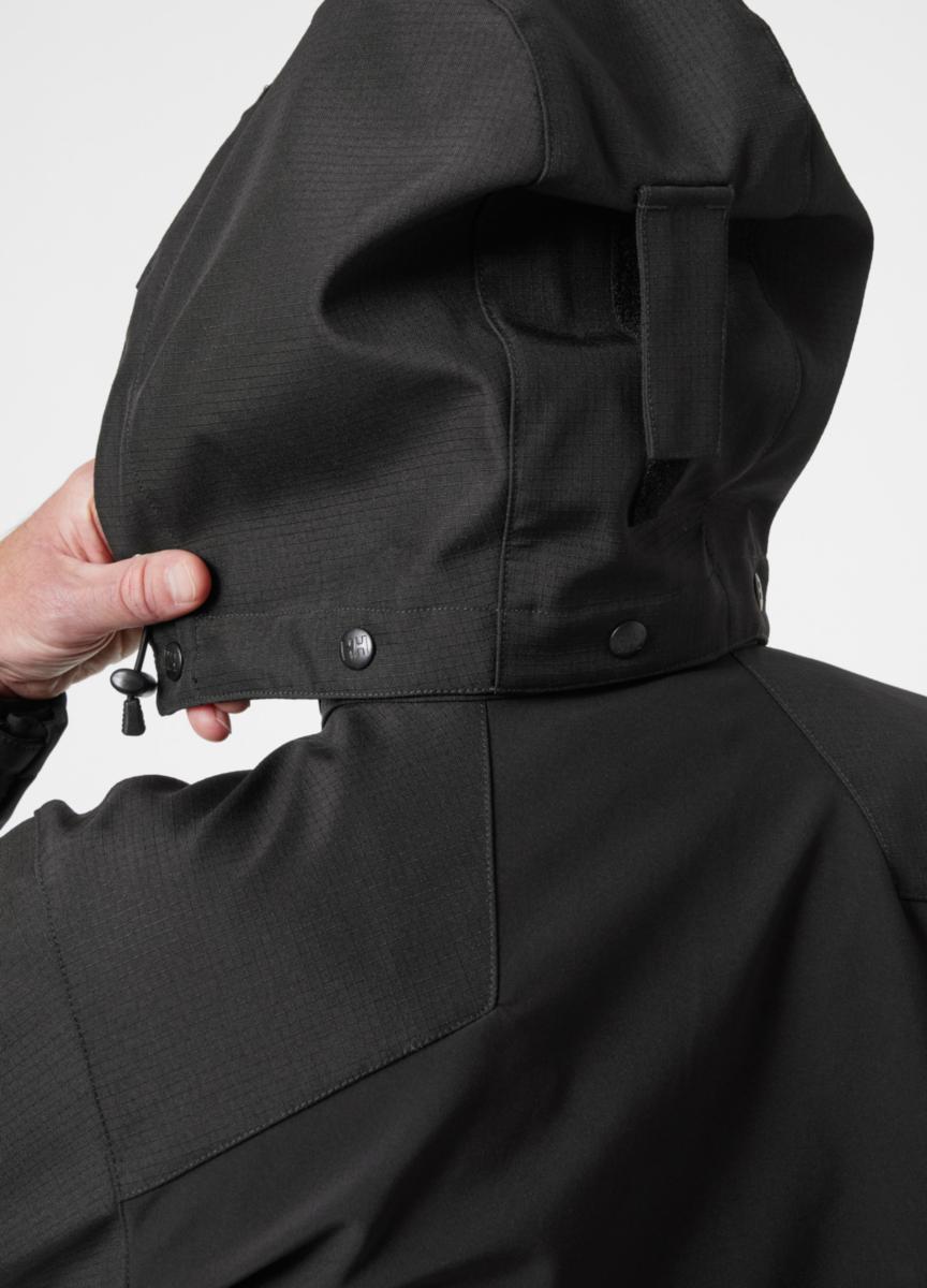 Ingen skuldersømmer. På- og avtakbar hette, fullt justerbar med elastisk strammesnor i åpning og borrelås bak. Innfesting av hette med trykknapper. Børstet materiale på innsiden av kragen. Store forlommer med YKK® glidelås. Formsydde ermer og borrelåsregulering i ermeavslutning. Forlenget rygg. Justerbar linning med strikk skjult i forlommer. Refleksdetaljer. PEFAS-fri. DWR-behandlet. Søm i AMMAN tråd.