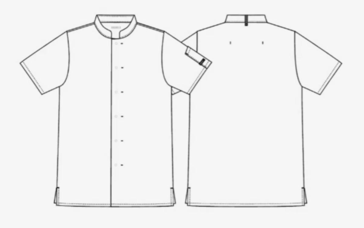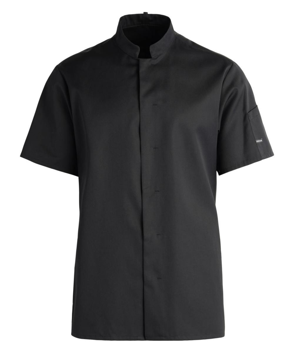 Meny kokkejakke med optimert unisex passfom - A snitt. Kokkejakke med korte ermer, skjulte trykknapper, pennelomme på venstre erme, nakkestropp til smekkforkle og splitt i siden.