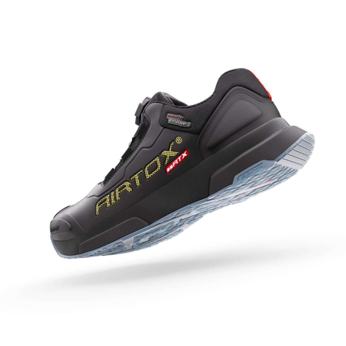 Den elegante RAVEN-svarte overdelen, med røde ATX-designdetaljer og den unike transparente yttersålen, skaper et moderne, dynamisk utseende. Innvendig gir WHITELAYER® spikertrampbeskyttelse en vekt på bare 32 gram, mens Nanotech-mikrofiberoverdelen og AIRTOX PRO-wire-systemet sikrer en god passform og utrolig komfort.
