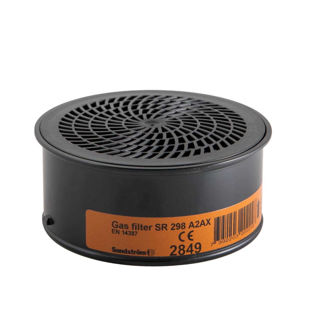 Gassfilter SR 298 er designet for bruk sammen med Sundström halvmasker og helmasker. Filteret er type A2AX og gir beskyttelse mot organisk gass og damp, som løsemidler. Gassfilteret kan enkelt kombineres med partikkelfilter SR 510 P3 R for å også gi beskyttelse mot aerosoler (partikler), f.eks. ved spraymaling.
