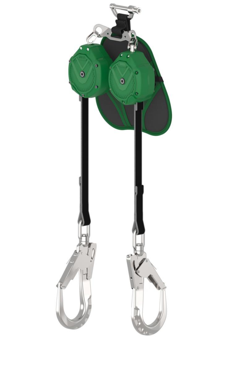 Twin fallblokk som muliggjør forankring under forflytning. Kompakt, lett og solid mini fallblokk i slagfast nylon. Polstret festeanordning for god bærekomfort. 1,8 meter bånd. Aluminium stillaskrok Ø60 mm med svivel. Maksimal brukervekt 140 kg. Standard: EN 360.