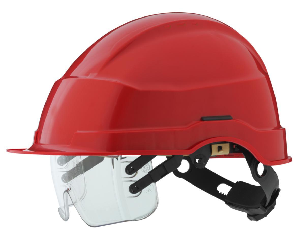 En svært godt balansert elektrikerhjelm produsert i slagfast ABS-plast. 6-punkts rattjustert innredning og dypt nakkebånd for god stabilitet og høy bærekomfort. Innredningen er justerbar i høyden og har myke tekstilbånd for høy komfort. Hodestørrelse 49 – 65 cm. Polstret svettebånd i kunstskinn. Kort brem for godt synsfelt og regnrenne som leder bort vann. Integrert vernebrille som kan felles helt inn i hjelmen. Brillen sitter i et spesialkonstruert og solid oppheng som gir en myk og glidende gange, følger ansiktets form, har sidebeskyttelse og kan tiltes for god beskyttelse. Brillen er i optisk klasse 1 og har god plass til vanlige briller under. 30 mm slisse for øreklokker.