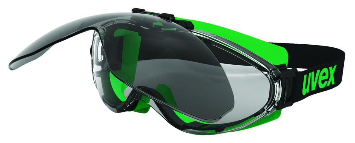 Permanent Uvex supravision HC-AF-belegg på den klare linsen og DIN 5 på den grå svettskyggelinsen (gass). Uvex Ultrasonic Flip-up er basert på Ultrasonic-modellen. Perfekte for gassveising, skjærebrennere m.m. og kan brukes utenpå de fleste briller med korrigerende linser. Den oppfellbare svettskyggelinsen beskytter mot skader fra sveiseperler. Den grå svettskyggelinsen begrenser ikke evnen til å skille farger. Beskyttelse mot UV- og IR-stråling. Enkelt å bytte den grå svettskyggelinsen. Uvex-beleggene på brillene er permanente, kan ikke vaskes bort, noe som gjør vernebrillene unike.