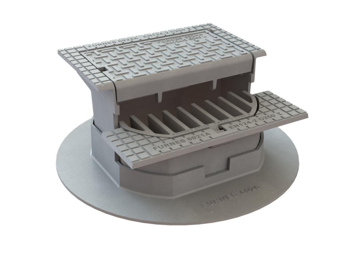 Kjeftsluk med frontrist. Sluket består av en underdel som kan forskyves 65 mm fremover/bakover i forhold til betongkummen/kansteinslinjen. Overdelen er todelt med en flytende ramme og hengslet tett lokk i fortau, og en flytende ramme med hengslet rist i veibanen. Disse kan justeres i høyden, uavhengig av hverandre.