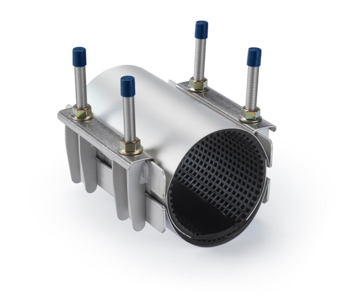 Ibeco rustfrie reparasjonsmuffer. Dobbelspent. Pakning i standard EPDM. Brukes i første omgang for å tette mindre korrosjonshull.