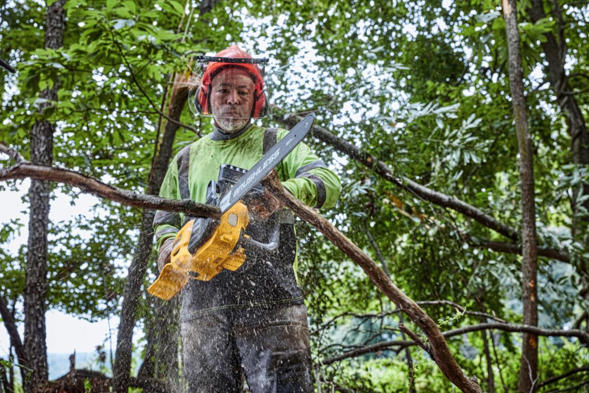 DEWALT 54V XR FLEXVOLT Kjedesag med høy effekt. Høy effektivitet/høy ytelse (tilsvarer 3 000 watt), elektronisk børsteløs motor. Har kraft tilsvarende en bensin-sag. 50 cm sverd og kjede for rask og effektiv kapping av store trestammer, tømmer. Profesjonelt verktøybasert kjedestramming for nøyaktig innstilling. Automatisk oljesmøring. N-versjonen leveres uten batteri og lader. Utvidet sortiment av 54V XR FLEXVOLT utendørs verktøy, batteridrevet, ingen utslipp.