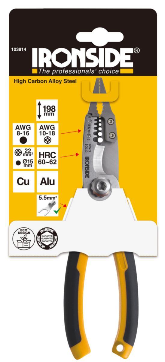 Tangen har et behagelig, overstøpt ergonomisk håndtak i PP+FG og TPR som gir godt grep og redusert belastning ved hyppig bruk. Kapasitet for kabler opptil 15 mm i diameter og 22 mm² lederareal, samt VCT 5.5 mm² x 3C. Kan brukes til pressing av 5,5 mm² kabelendehylser og terminaler – perfekt for ryddige og sikre elektriske avslutninger. Egnet for avmantling av både flettet ledning (AWG 10–18) og solid ledning (AWG 8–16).