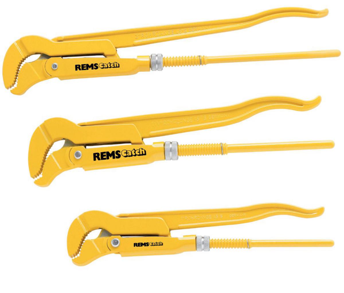 REMS Catch S 1"" + S 1½"" + S 2"" S-kjeve-rørtenger, svensk modell. DIN 5234 – Form C. Robust kvalitetsverktøy for hard belastning og lang levetid. Robust utførelse av krom-vanadium-stål, helstål-senkesmidd, herdet, pulverbelagt. Herdet, meget slitesterk fortanning.
