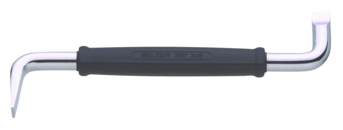 Vinkelskrutrekker for sporskruer DIN 5200 Forniklet og forkrommet med håndtak av polypropylen Begge ender vinklet 90°. Sporposisjon h.h.v. 0° og 90°
