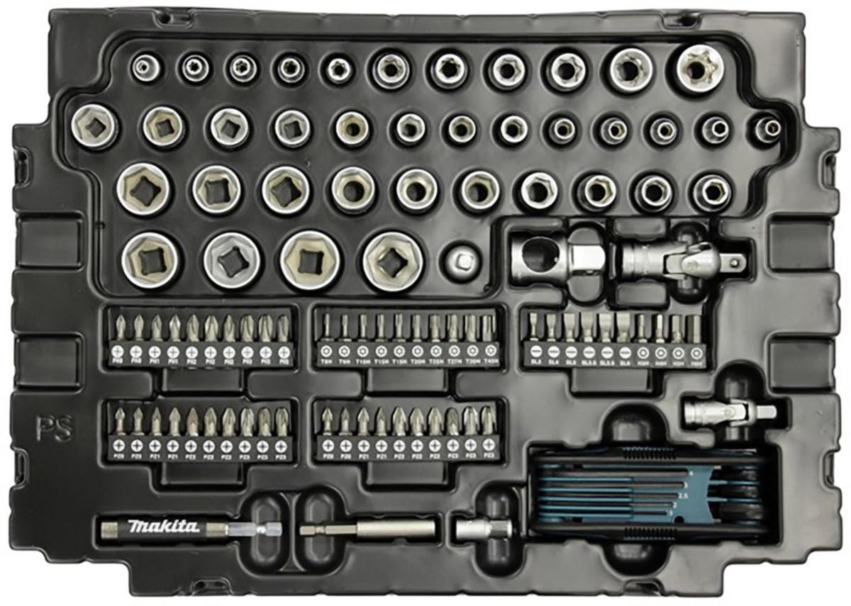 Verktøysett med 120 deler. Makpac koffert som inneholder assortert utvalg bits, bitsholdere, piper, pipetilbehør, skraller, skrutrekker, umbrako, fastnøkler og overganger. Med dette verktøysette har man et ryddig og godt utvalg verktøy for diverse montasjer i hjemmet.