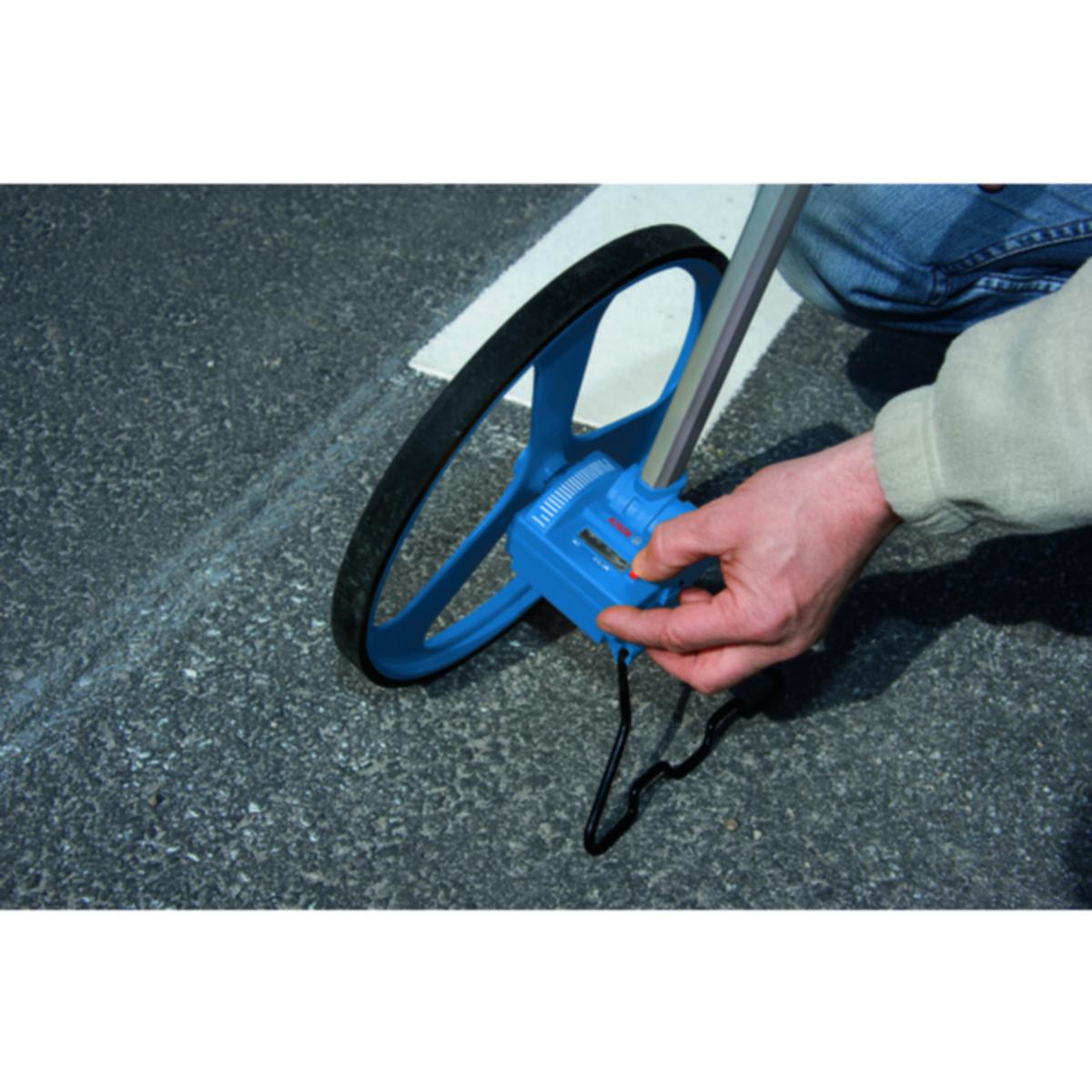 Det robusta mäthjulet för byggarbetsplatsen. 6-siffrigt räkneverk som är lättavläst och stöttåligt. Smidig återställning med knapptryck. Enkelt hopfällbar för smidig transport. PTB-certifierad. Hjuldiameter (omkrets) 389,1 mm (1,22 m). Mätnoggrannhet ± 5 cm/100 m.
