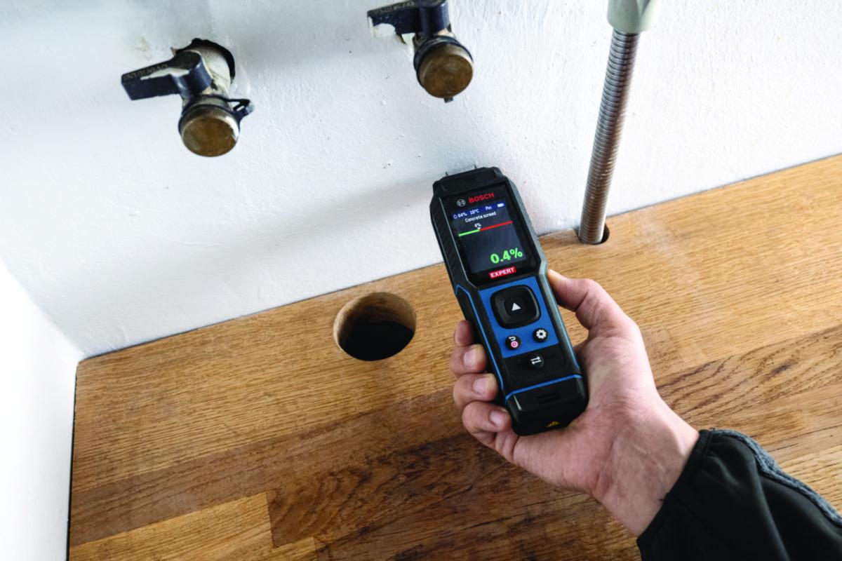 Boschs mest avanserte fuktmåler. Kombinerer tre sensorer for komplett fuktanalyse: pinnemåling (motstand), pad-sensor (elektromagnetisk felt) og termo-hygrometer for omgivelsesmålinger. Robust og slagfast instrument med gummiert hus og IP65-klassifisering. Måler fukt i 37 tresorter og 10 byggematerialer. Knappen lar deg enkelt veksle mellom pad- og pinnesensor. Pad-sensoren gir rask skanning av store områder, med en tørr sone som referanse. EXMM3-17 sporer også omgivelsestemperatur og relativ luftfuktighet. Kompatibel med BA 3.7V 1.0Ah A batteripakke. Funksjoner inkluderer automatisk selvtest, referansemodus, og Hold-knapp for målinger, samt justerbar lydfeedback.