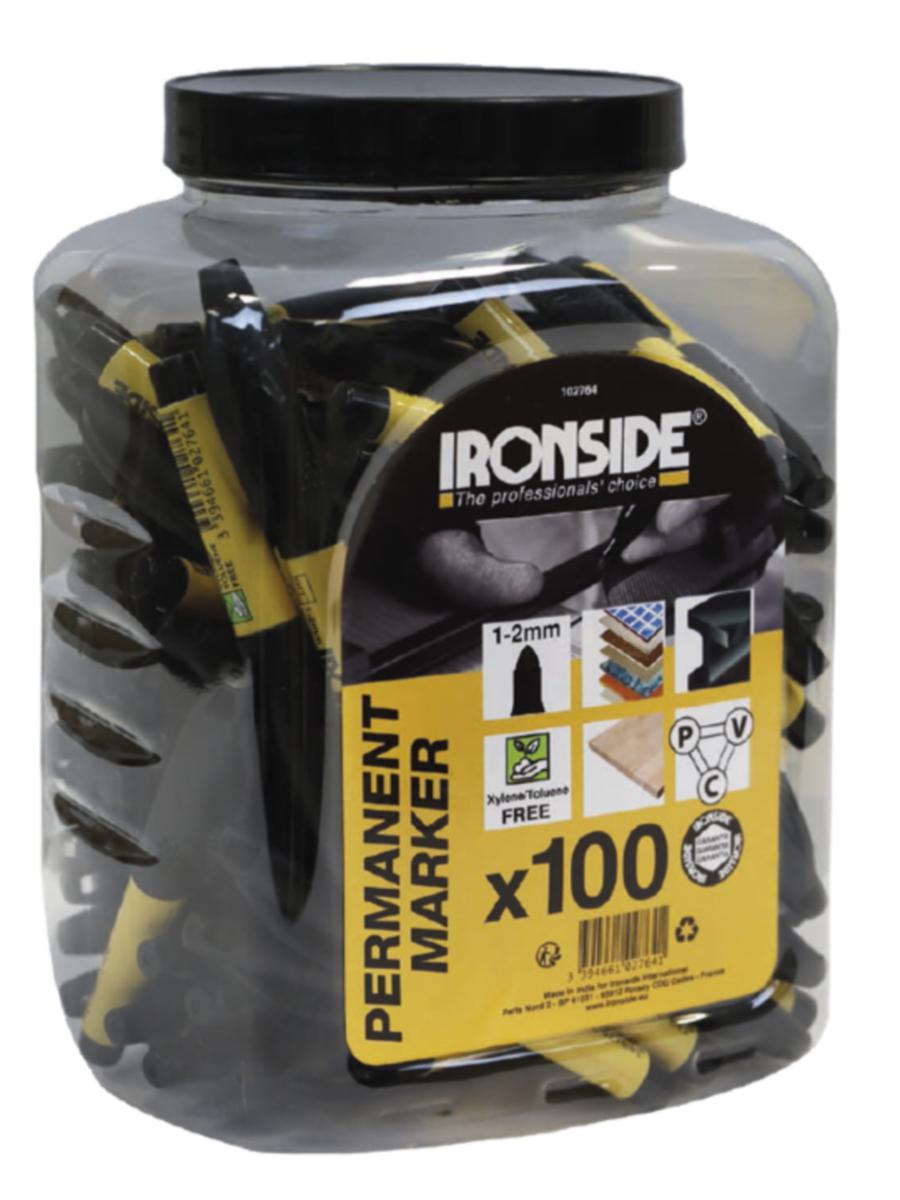 Rund spiss 1-2 mm. Vanntett. Egnet for både ubehandlede og behandlede overflater. Hurtigtørkende (vanskelig å fjerne). Fri for xylen og toluol. Display inneholder 100 stk.