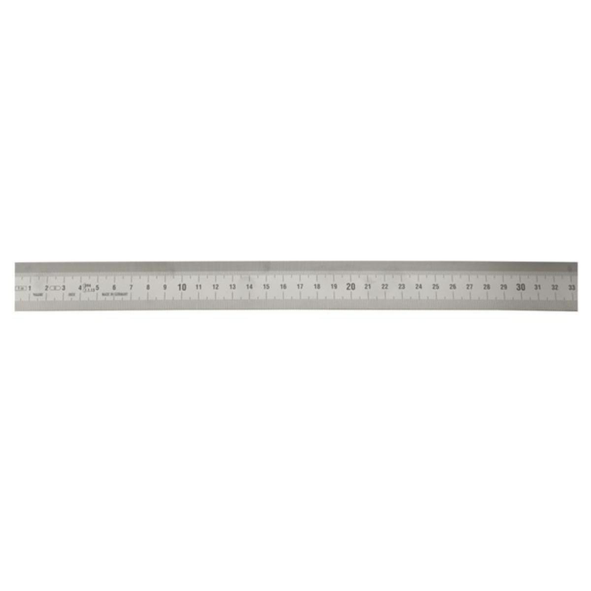 Mattforkrommet stållinjal i rustfritt stål med 1 mm og 0.5 mm inndeling. Gangetabell samt omregningstabell fra tommer til mm på baksiden.