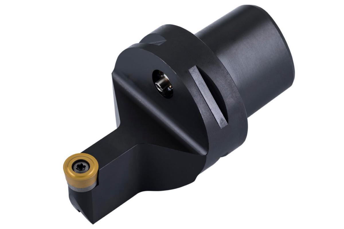 Dreiebenkholder med skrueklemme for å holde en rund positiv indekserbar innsats med en diameter på 12 mm, 4,76 mm tykk (ISO-betegnelse RC .. 1204MO), nøytral side- og endeinnsats, rett aksel i henhold til ISO 26623 (Polygon Shaft coupling) størrelse C4 , med 50 mm fremspringslengde for boksdreining, kopivarsel i en eller flere retninger og lengdesving uten skulder.