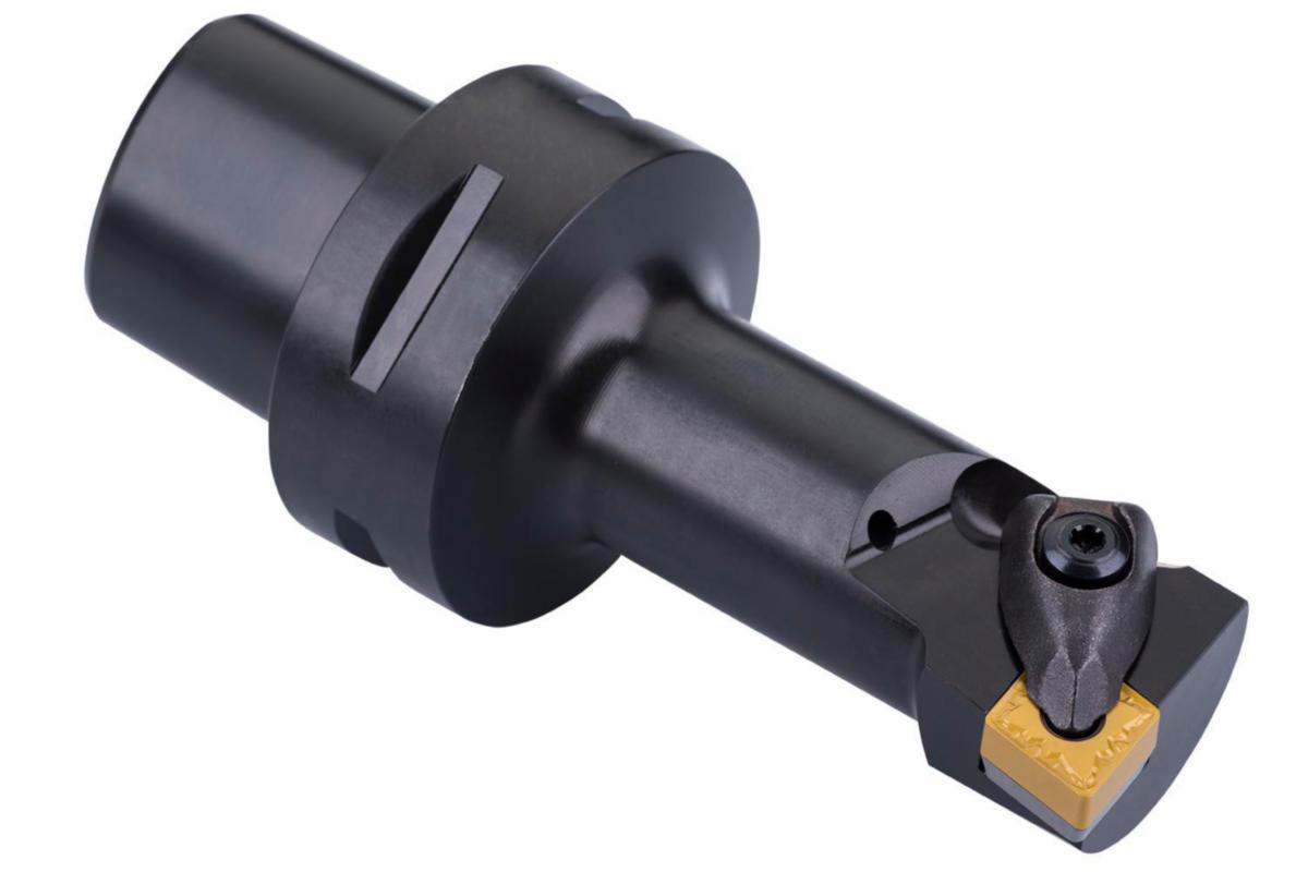 Dreiebenk med dobbel spenning for å holde en 80 ° diamant negativ indekserbar innsats med en innskrevet diameter på 12,7 mm, 4,76 mm tykk (ISO-betegnelse CN .. 1204 ..), venstre / høyre 95 ° sideinnsats, forskjøvet aksel i henhold til ISO 26623 (Polygon Shaft coupling) størrelse C5, med 17 mm bredde og 90 mm fremspringslengde for innvendig konkave vendinger og interne langsgående vendinger med eller uten skulder.