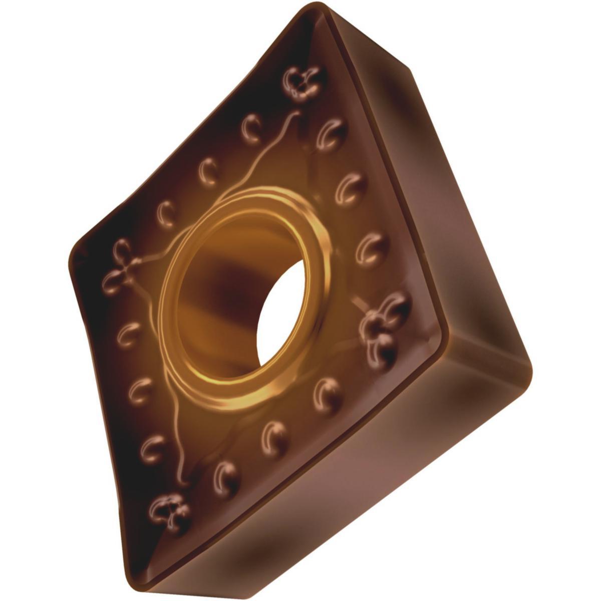 Enkelt endt negative dreieskjær, 80° rhomboid med tilpasset sirkeldiameter, indekseringsnøyaktighet i henhold til ISO-toleranse klasse-M, sponbryter OR med rundt skjæregg i type T8430, a PVD belagd finkornet WC-Co karbid innenfor ISO område P25-P40 fra medium til ekstra grov maskinering av stål.
