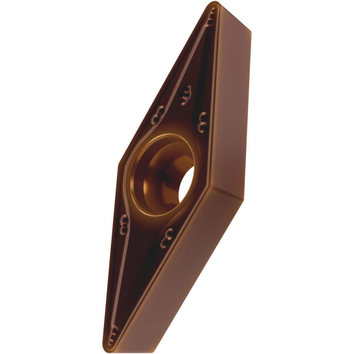 Enkelt endt positive dreieskjær, 35° rhomboid med 5° klarering, tilpasset sirkeldiameter, indekseringsnøyaktighet i henhold til ISO-toleranse klasse-M, sponbryter RM med rundt skjæregg i type T8430, a PVD belagd finkornet WC-Co karbid innenfor ISO område P25-P40 og M20-M35 fra fin til grov maskinering av stål og rustfritt stål.