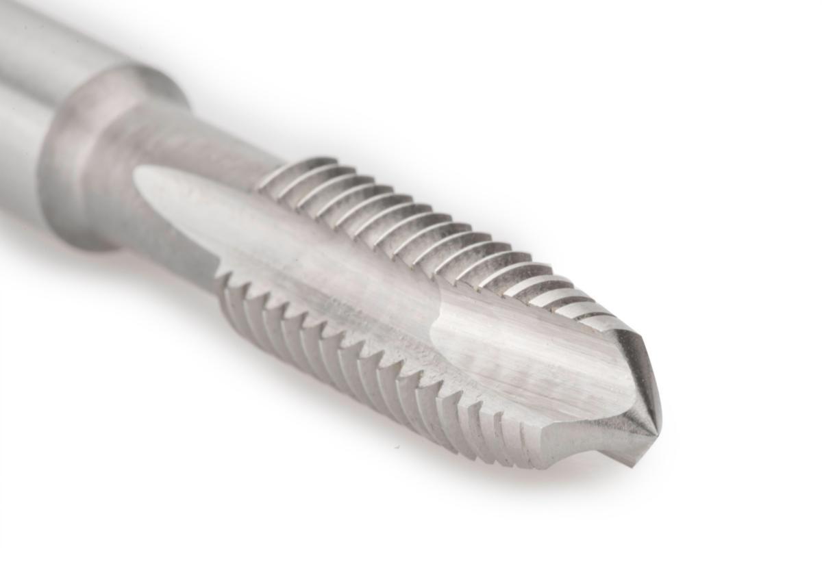 M-grovgjenget. Maskingjengetapp med spondrivende innsats for gjennomgående hull. Høyhastighets stål. ISO 529. Forsterket skaft. For gjenger i konstruksjonsstål, ulegert stål, aluminium-magnesium, kobber, bronse og messing.