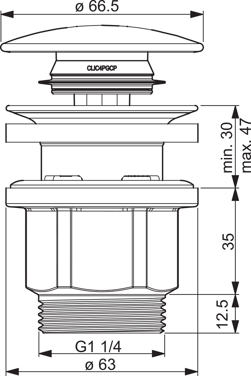 Bunnventil i plastutførelse som åpnes og lukkes med et enkelt trykk på pluggen. Medfølgende del for konstant åpen ventil hvis ønskelig.