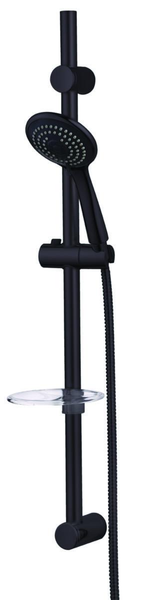 Dusjsett Lux IV svart stang 25 mm, øvre brakett fleksibel slik at eksisterende hull kan brukes. Hånddusj 110 mm med antikalkfunksjon, slange i rustfritt stål med vridningsfunksjon, såpekopp.