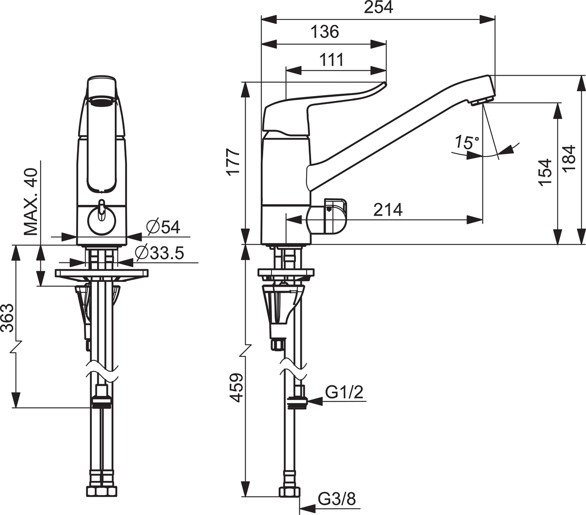 - Byggehøyde, undersiden av kranutløp: 154 mm