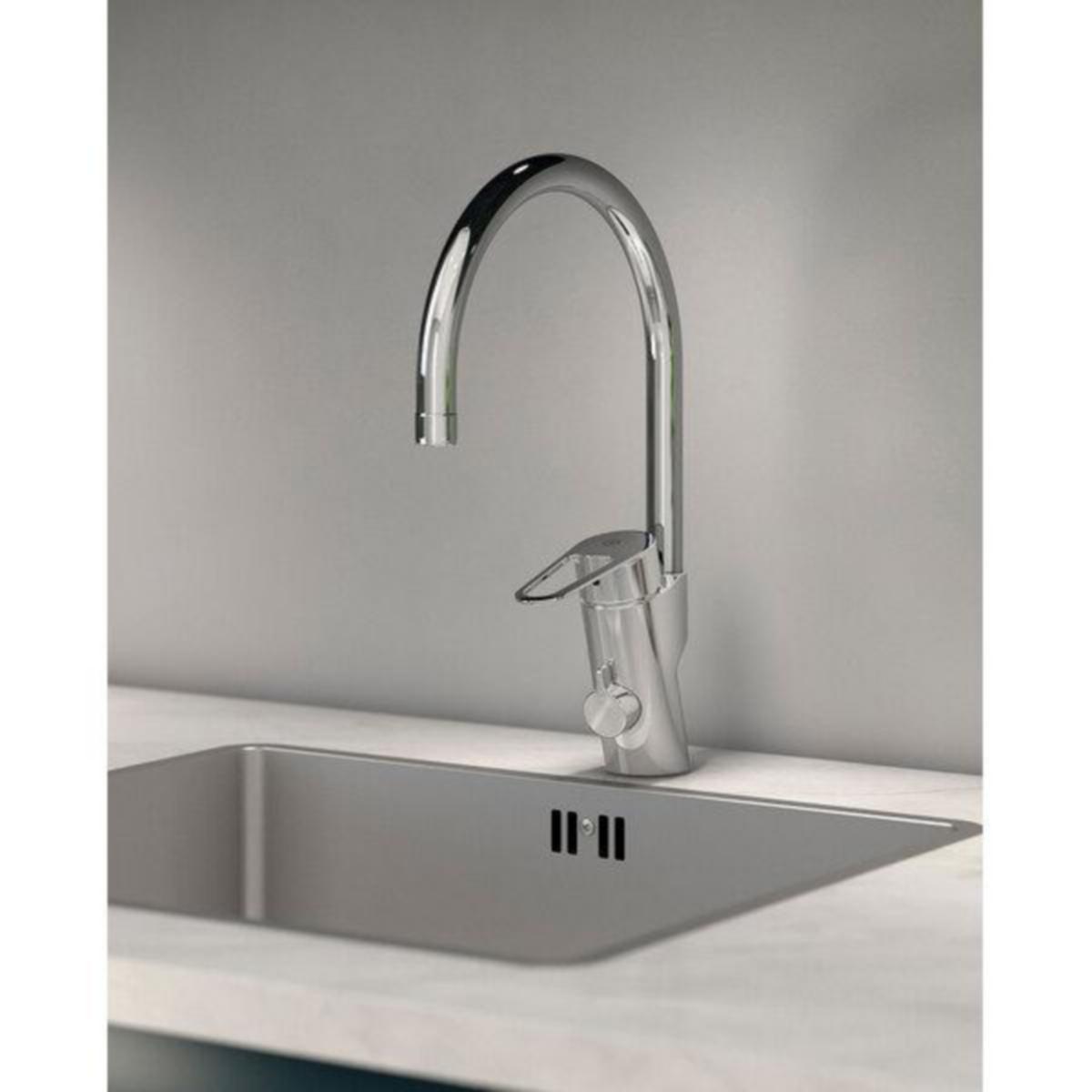Kjøkkenkran med høy tut, leveres med eller uten avstengning for oppvaskemaskin. Produktet har energiklasse C, justerbar vannmengde og komforttemperatur.