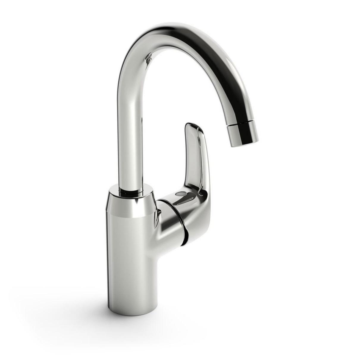 Servantbatteri med høy svingbar tut og sidegrep. Det er også innebygd alternative begrensninger for vanntemperatur og maksimal vannmengde. Med fleksible slanger.