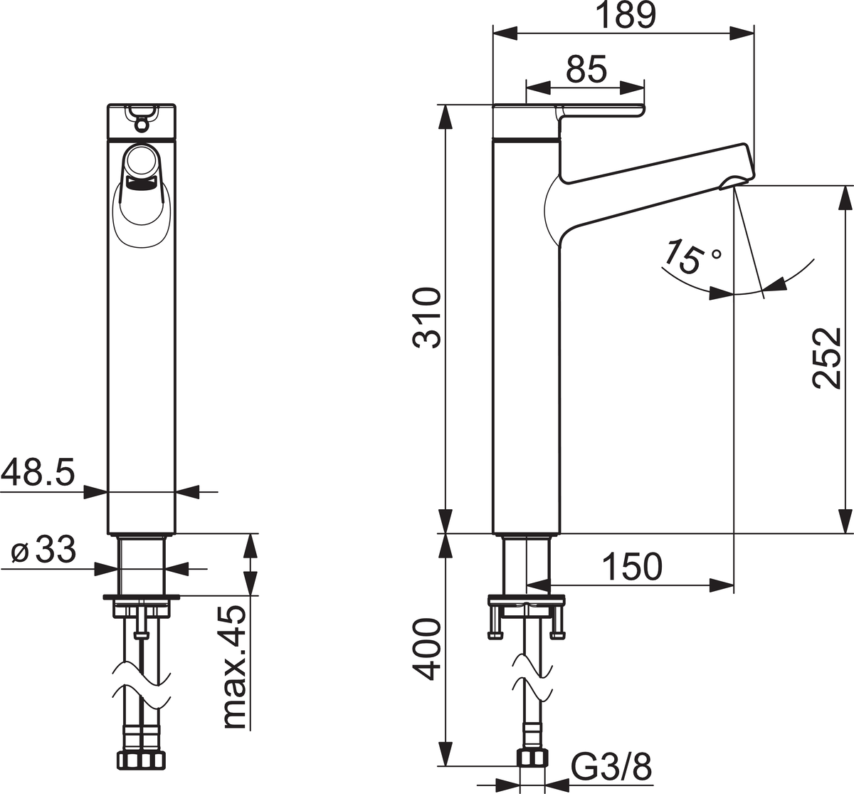 - Byggehøyde, undersiden av kranutløp: 252 mm