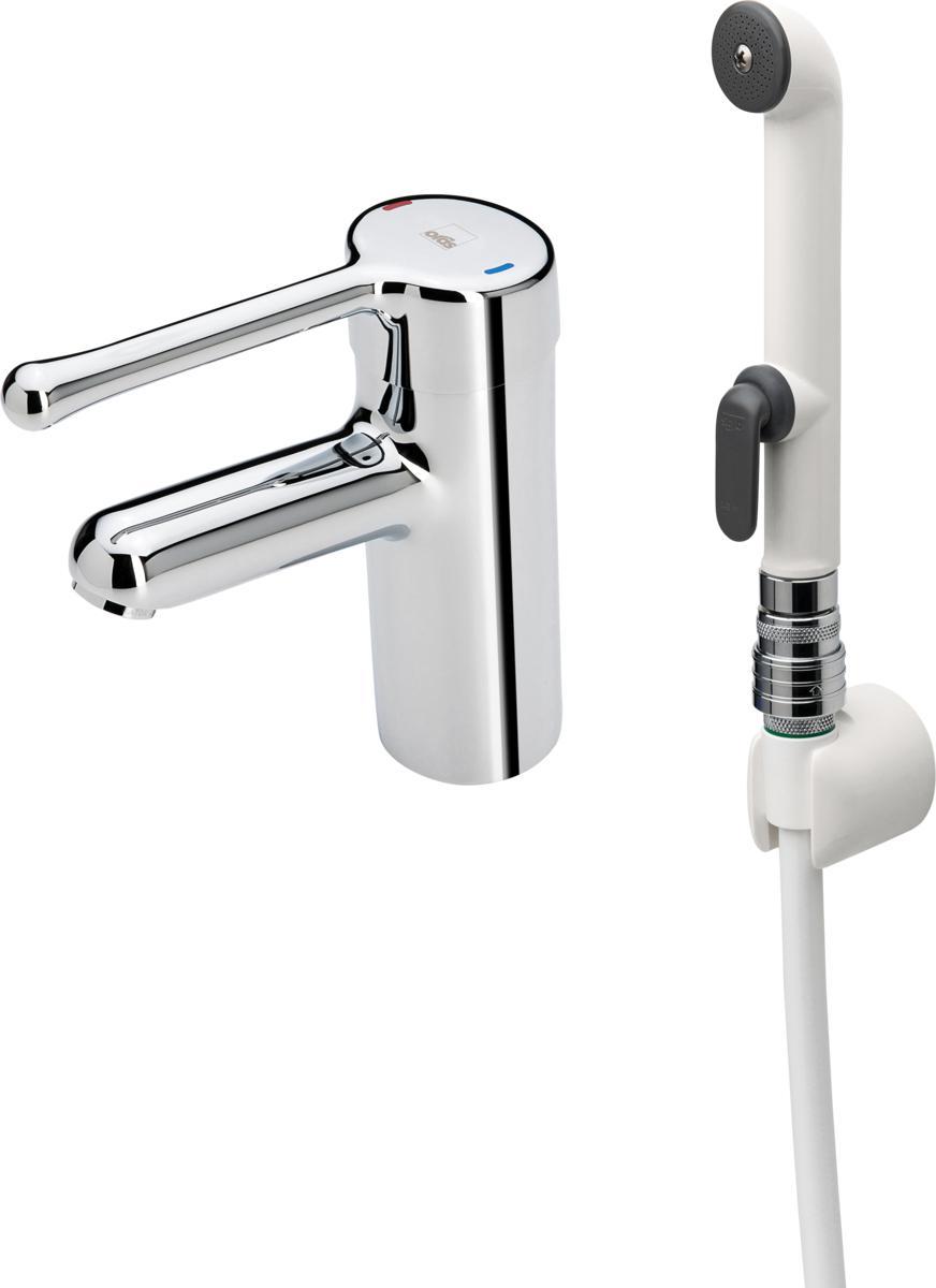 Servantkran med desinfeksjonsbar Bidetta hånddusj. Lang pinnehendel gir god brukervennlighet for alle brukere og situasjoner. Fast tut og laminær stråle. Dusjslange 1,5 m, veggfeste, to hurtigkoblinger. Fleksible slanger med tilbakeslagsventil integrert. G3/8