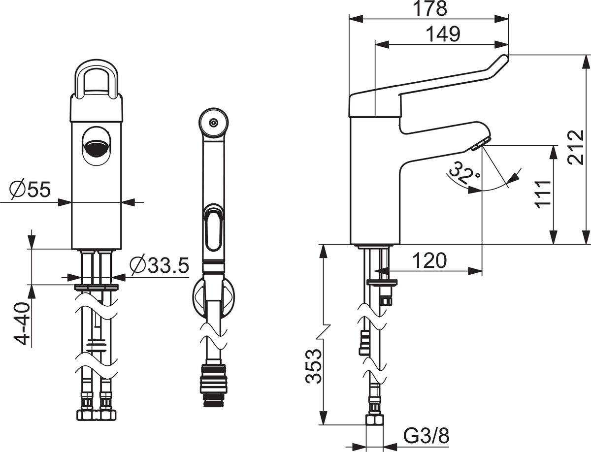 Servantkran med desinfeksjonsbar Bidetta hånddusj. Lang bøylehendel gir god brukervennlighet for alle brukere og situasjoner. Fast tut og laminær stråle. Dusjslange 1,5 m, veggfeste, to hurtigkoblinger. Fleksible slanger med tilbakeslagsventil integrert. G3/8